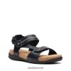 costura artesanal dá um toque terroso à sandália básica roseville mae. sua parte superior ajustável em couro preto robusto proporciona um ajuste confortável aos pés