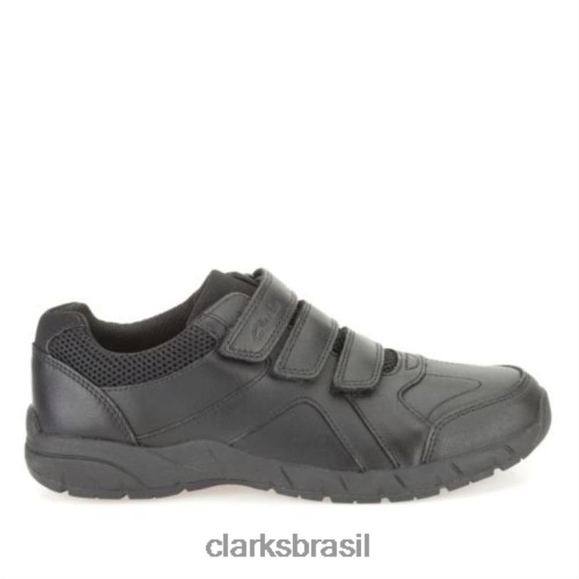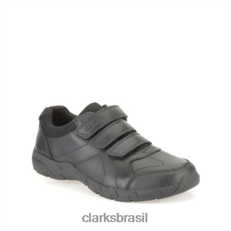 sapatos escolares para meninos repletos de benefícios comprovados e confiáveis da Clarks. a parte superior em couro preto revestido durável é fixada com tiras triplas de fita adesiva para um ajuste seguro, enquanto o visual esportivo é aprimorado pela sola robusta e proteção dos dedos e uma gola acolchoada confortável. Air Spring FX adiciona amortecimento sublime sob os pés, enquanto uma palmilha removível e forros antimicrobianos Agion ajudam a banir bactérias e manter os pés frescos.