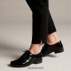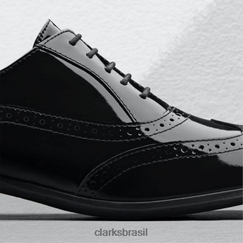 nossos brogues femininos mais vendidos em um clássico preto patenteado. laços autênticos e detalhes perfurados adicionam ao visual premium que é finalizado com um salto folheado com efeito empilhado e com nossa exclusiva tecnologia Clarks Cushion Plus.